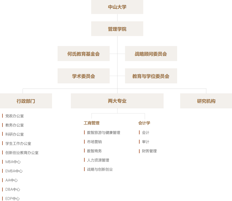 概况 院长致辞 学院概况 学院简介 学院历史 数字管院 学院荣誉 国际认证 组织机构 组织机构 战略顾问委员会、基金会 学院领导 名誉院长 行政管理部门 导航痕迹 首页 概况 组织机构 组织机构Organizational Structure