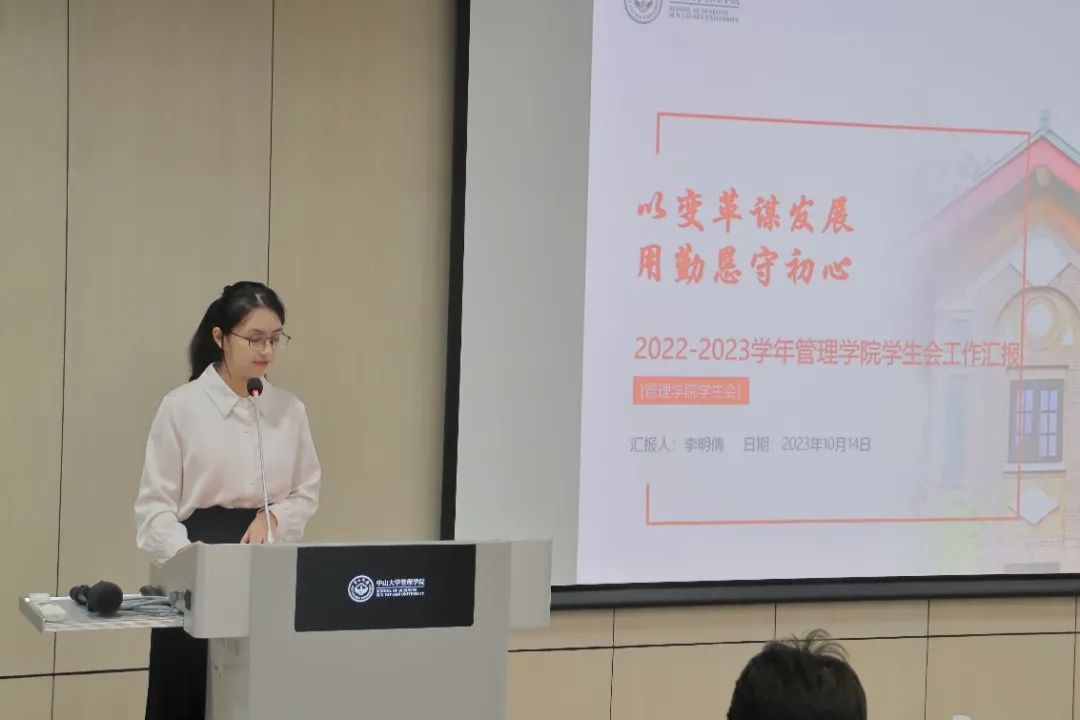 大会审议通过了管理学院学生会轮值主席李明倩同学所作的2022-2023年度管理学院学生会工作报告和管理学院学生会章程报告。
