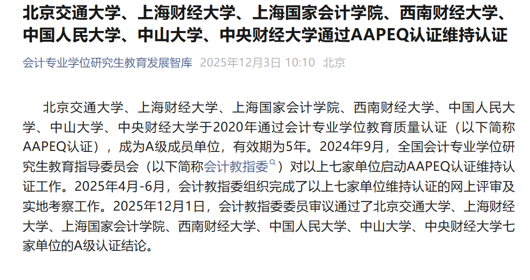 近日,全国会计专业学位研究生教育指导委员会(以下简称“会计教指委”)公布了中山大学等7家单位会计硕士专业学位教育质量认证(Accreditation for Accounting Professional Education Quality,以下简称“AAPEQ认证”)维持认证结果。继2015年成为首批AAPEQ认证A级成员单位以及2020年二次获得最高等级A级认证,我校三度获得A级认证结论。该认证结果的取得,进一步展现了我院 MPAcc 项目在高素质会计专业人才培养方面的突出优势与过硬实力。