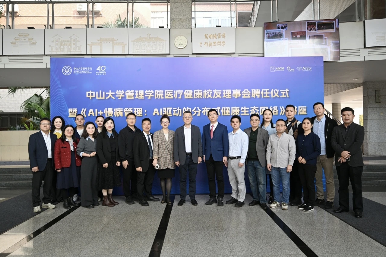 2025年12月6日,中山大学管理学院医疗健康校友理事会聘任仪式暨《AI+慢病管理:AI驱动的分布式健康生态网络》专题讲座在中山大学南校园善思堂顺利举行。管理学院院长李广众教授、刘静艳教授,管理学院医疗健康校友理事会会长谢方敏,副会长闫华伟、刘鲜河、潘金明等出席仪式,仪式由刘静艳教授主持。