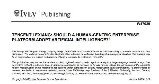 11月13日入选的案例《Tencent Lexiang: Should A Human-Centric Enterprise Platform Adopt Artificial Intelligence?》(案例编号:W47029),案例围绕腾讯旗下企业平台产品“腾讯乐享”(LeXiang)在人工智能快速扩张背景下所面临的战略抉择展开,呈现了腾讯在企业级服务领域坚持“以人为本”产品理念与人工智能技术浪潮之间的张力与选择。该案例是教育部产学合作协同育人项目的成果之一。腾讯乐享最初作为腾讯内部平台而生,长期以来以促进组织成员之间真实、具情感温度的互动为核心,后逐步商业化并发展为覆盖超过30万家组织的企业级SaaS平台。然而,随着竞争者纷纷在企业协作工具中引入智能助手、自动化内容生成与知识问答等AI功能,乐享团队在季度产品会上陷入了关键讨论:应否坚持平台的人本定位,还是顺应行业趋势将AI深度融入产品?案例通过呈现内部争论、客户需求差异、竞争态势与腾讯自身的技术基础,引导读者审视乐享在“人本体验”与“技术进化”之间应如何寻求平衡。