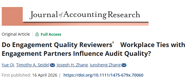 管理学院2025届新毕业的博士生齐悦在校期间的研究成果《Do Engagement Quality Reviewers’ Workplace Ties with Engagement Partners Influence Audit Quality?》近日在国际顶级期刊Journal of Accounting Research上发表。