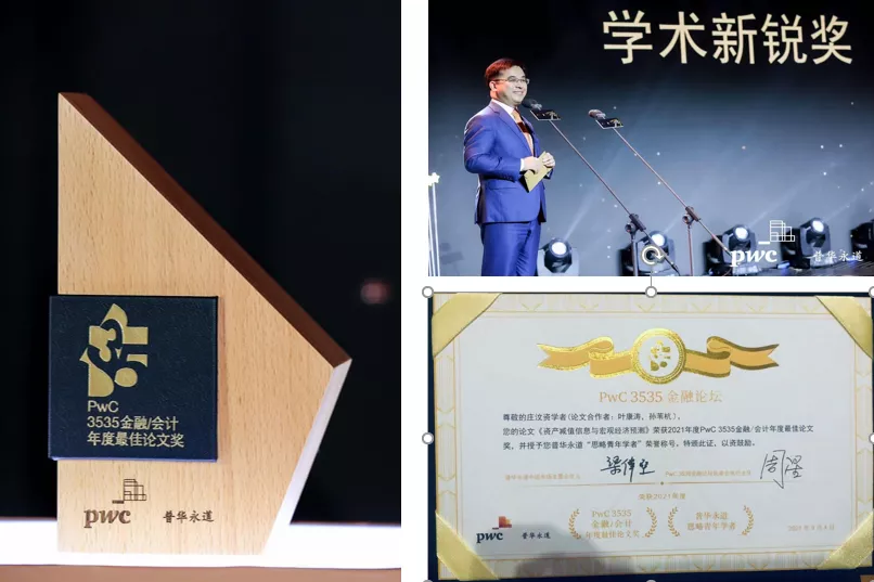 2021年9月4日晚,作为中国国际服务贸易交易会的重要活动,“普华永道PwC 3535金融/会计年度最佳论文奖”颁奖典礼在北京成功举办。我院27岁的助理教授庄汶资博士凭借其合作论文《资产减值信息与宏观经济预测》获得“PwC 3535金融/会计年度最佳论文奖”和“PwC 3535金融/会计学术新锐奖”,是唯一获得两个奖项殊荣的青年学者。同时,庄汶资博士还被授予“普华永道思略青年学者”荣誉称号。