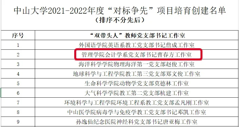 近日,中共中山大学委员会组织部发布《中山大学 2021-2022 年度“对标争先”项目培育创建名单》,其中,我院工商管理系党支部、本科生第二党支部和学术硕士研究生第一党支部3个党支部入选样板支部培育创建名单,会计学系党支部书记曹春方工作室入选“双带头人”教师党支部书记工作室培育创建名单。