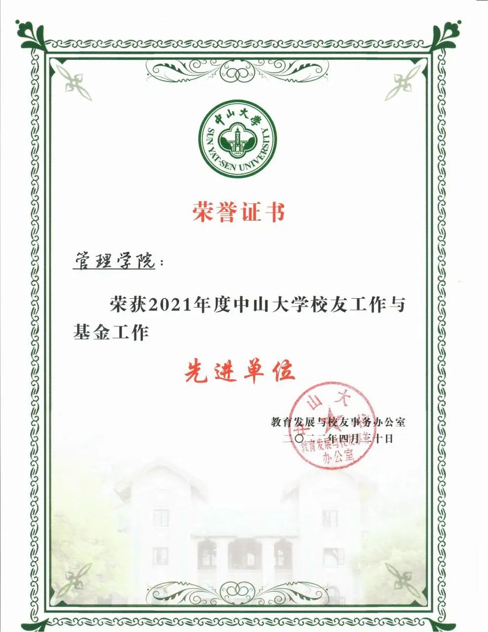 管理学院荣获“2021年度中山大学校友工作与基金工作先进单位”称号