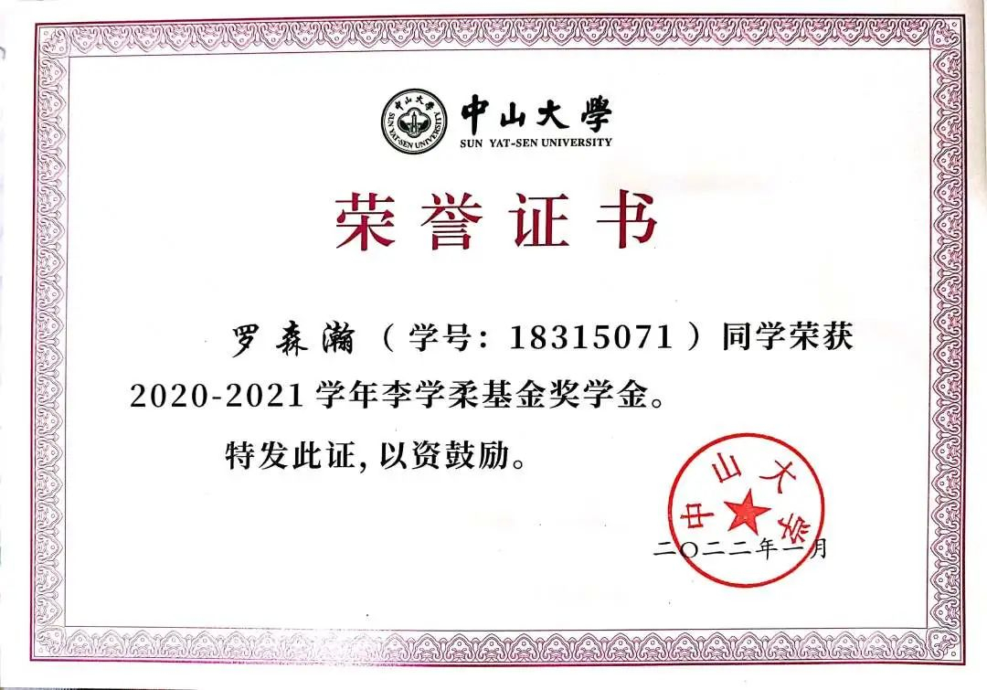 在2020-2021学年,他综合成绩专业排名第一(前0.6%),获得了国家奖学金、中山大学优秀学生奖学金一等奖、第十二届李学柔基金奖学金等荣誉。同时,他乐于分享自己的学习经验,帮助更多同学精进学业,曾撰写过一篇经验分享稿件《国奖风采(一) | 罗森瀚:以梦为马,不负韶华》,发布于学院学生微信公众平台,获得超2500次阅读。