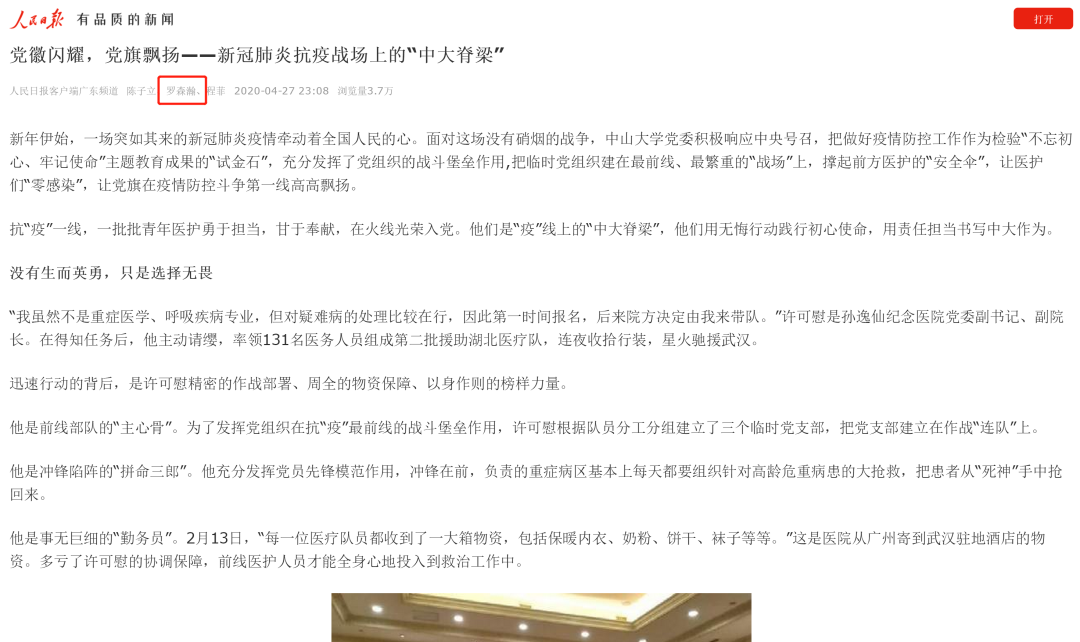 2020年2月,在新冠肺炎疫情暴发初期,他与家人积极沟通、协调,向家乡捐赠了1.2吨消毒酒精和760公斤消毒液。同年3月,他积极响应学校党委的号召,成为学校党委宣传部“战疫报道”工作的学生记者,署名文章《党徽闪耀,党旗飘扬——新冠肺炎抗疫战场上的“中大脊梁”》刊登至中山大学新闻网,并被人民日报客户端转发,阅读量近4万。