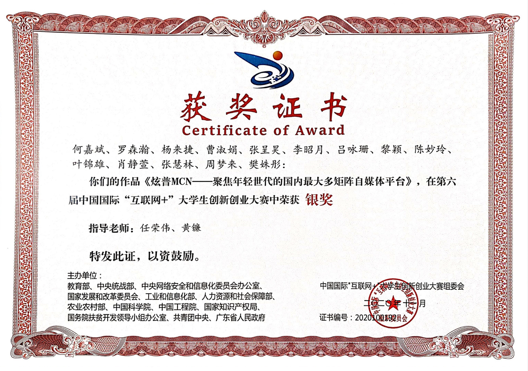 在创新创业的舞台上,他同样披荆斩棘,勇获佳绩。在2020年第六届中国国际“互联网+”大学生创新创业大赛中,他作为团队负责人,带领创业项目从全国147万个项目中脱颖而出,进入高教主赛道前300强(全国前0.02%),获第六届中国国际“互联网+”大学生创新创业大赛全国银奖。2021年,他参与的项目又获第七届中国国际“互联网+”大学生创新创业大赛广东省金奖。