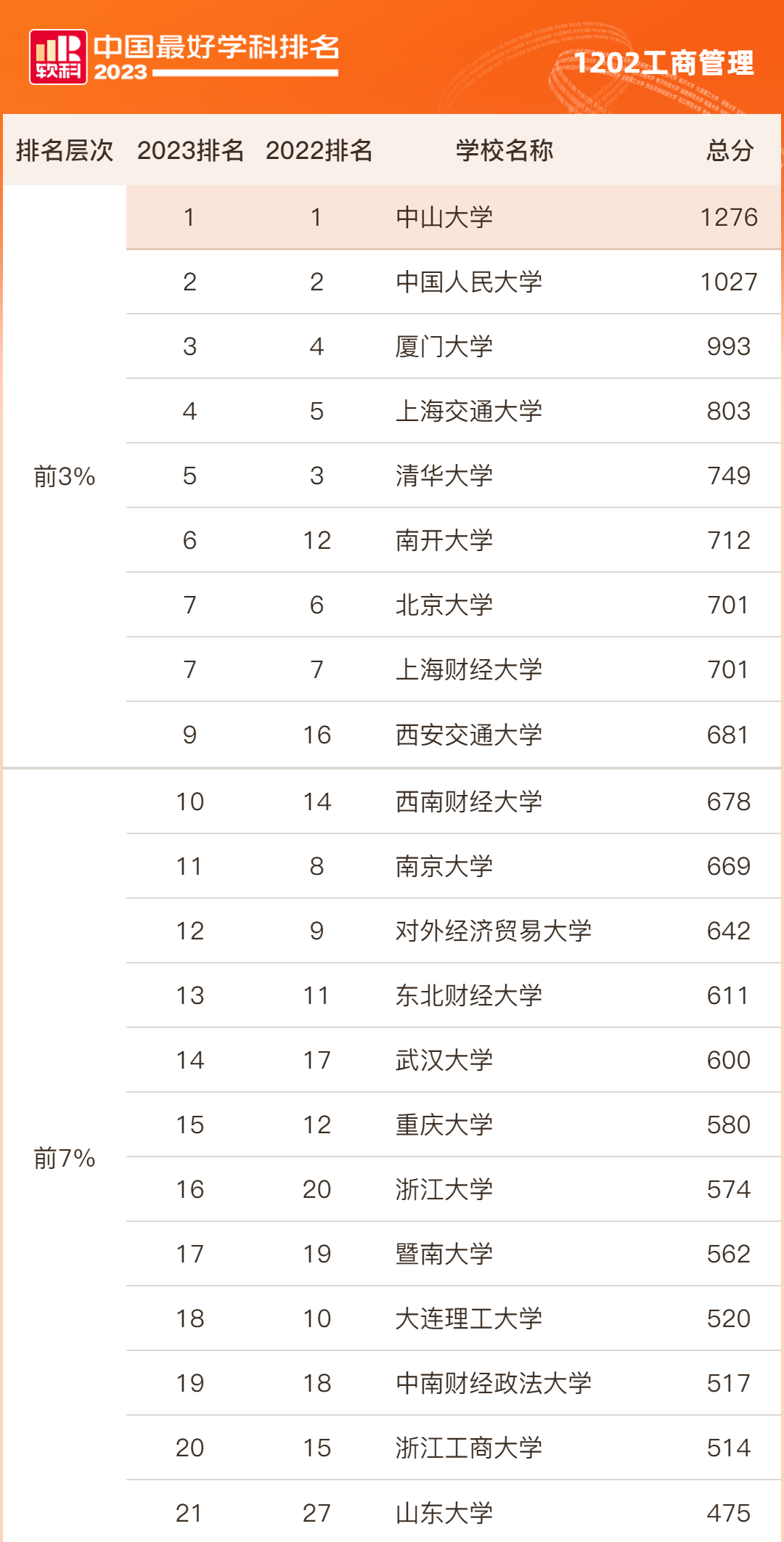 2023年11月8日,高等教育评价专业机构软科正式发布“2023软科中国最好学科排名”。中山大学工商管理学科再次领跑,在全国307所拥有工商管理学科的高校中,连续五年排名全国第一。据悉,本次工商管理学科排名共有153所大学上榜,中山大学、中国人民大学、厦门大学、上海交通大学、清华大学、南开大学、北京大学、上海财经大学、西安交通大学位列前3%。
