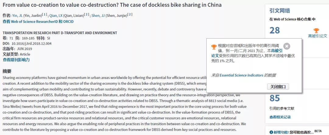According to the latest search report of Web of Science database, the paper published by Associate Professor Yin Juelin of our school was selected into The World's Top 1% Highly Cited Paper". The result of the team of Associate Professor Yin Juelin (first author) "From value co-creation to value co-destruction? The case of dockless bike sharing in China” was published in June 2019 in TRANSPORTATION RESEARCH PART D-TRANSPORT AND ENVIRONMENT - a high-level international journal in the intersection of transportation and environment. In 2018, Associate Professor Yin Juelin (first author) published his paper “Sharing Sustainability: How Values and Ethics Matter in Consumers’ Adoption of Public Bicycle-Sharing Scheme” in Journal of Business Ethics - a high-level international journal. From the perspective of culture, social psychology and ethics, the paper studied the antecedent variables and their mechanism. And the paper was selected into "The World's Top 1% Highly Cited Papers" in 2019, which also helps promote attention to the Chinese institutional and cultural environment and management issues and practices with Chinese characteristics.
