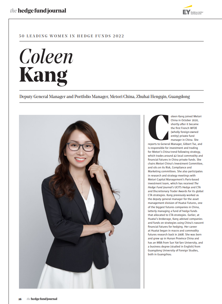 The special issue of the Hedge Fund Journal, an international authoritative journal in the hedge fund industry, recently selected the list of "50 Leading Women in Hedge Funds 2022" to recognize and encourage outstanding female practitioners. Coleen Kang, MBA alumna of our school enrolled in 2012, was honored to make the list. This is the 10th special issue of the journal, which in the past nine issues was dominated by female hedge fund executives in the US and Europe. The highlight of this year's list is the inclusion of two female foreign hedge fund executives working in fund management in mainland China, including Coleen Kang, alumna of our school.
