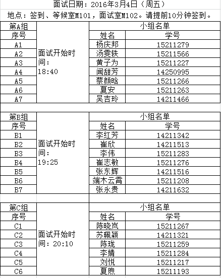 1. 面试时间:2016年3月4日(周五)晚18:40-20:55。请各位候选人提前至少10分钟到达,签到地点:南校区管理学院善思堂M101教室。面试考场:南校区管理学院善思堂M102教室。